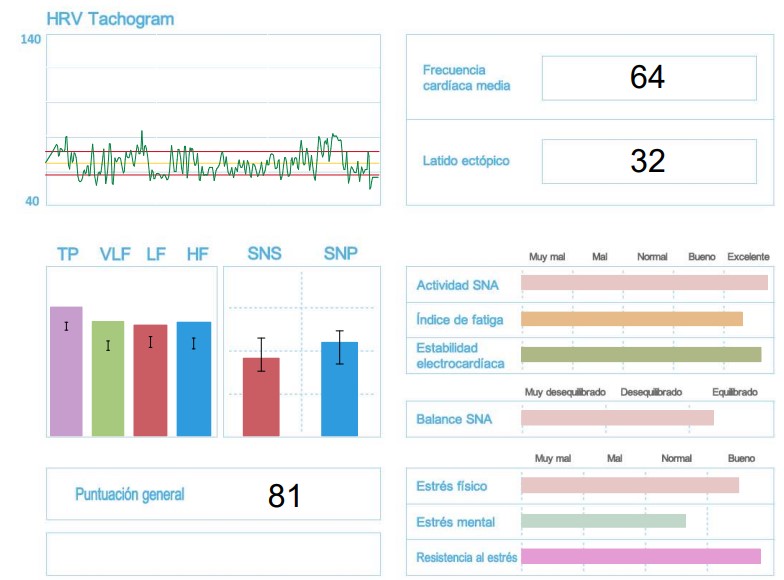 El Sistema Nervioso Autónomo esta formado por el Sistema Simpático (respuesta al stress que genera taquicardia) y el Sistema Parasimpático (que lo contrabalancea generando bradicardia). La Fotoplestimografía digital de segunda derivada permite la evaluación del Sistema Nervioso Autónomo, a través del análisis de la variabilidad de la frecuencia cardíaca y sus componentes. Producto de este análisis, se genera un puntaje general que nos permite determinar, si este sistema está Balanceado o Disbalanceado. Pudiendo determinar la adaptación de la persona al stress físico y mental.