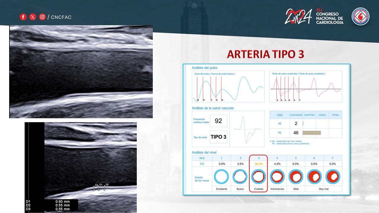 Ejemplo: Niño de 10 años con Obesidad que presenta Arteria Tipo 3 y al valorar el espesor de la pared de la carótida con un Ecodoppler de los vasos del cuello, muestra un engrosamiento patológico de su pared, que confirma un envejecimiento vascular precoz secundario a su obesidad. Caso presentado en el Congreso Nacional de Cardiología 2024. Rosario Argentina. Gráfico al pie.